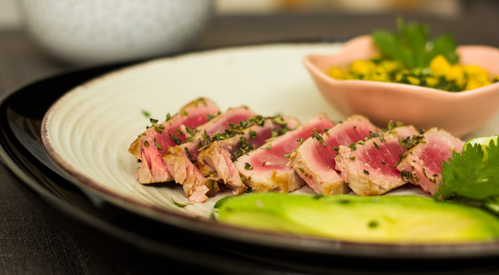 Sellamos el filete de atún Umi Foods en aceite vegetal a fuego alto, un minuto por lado. Dejamos reposar 5 minutos antes de cortar en pequeños filetes.