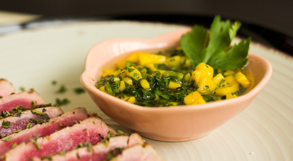 Hacemos el chimichurri cortando el culantro finamente, luego cortamos los ajos y el mango en cubitos pequeños, mezclamos con el aceite y el vinagre y sazonamos al gusto con aceite y sal.