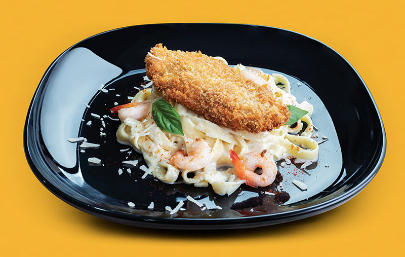 6. Servir con el filete de dorada empanizado, langostinos y queso parmesano rallado encima.