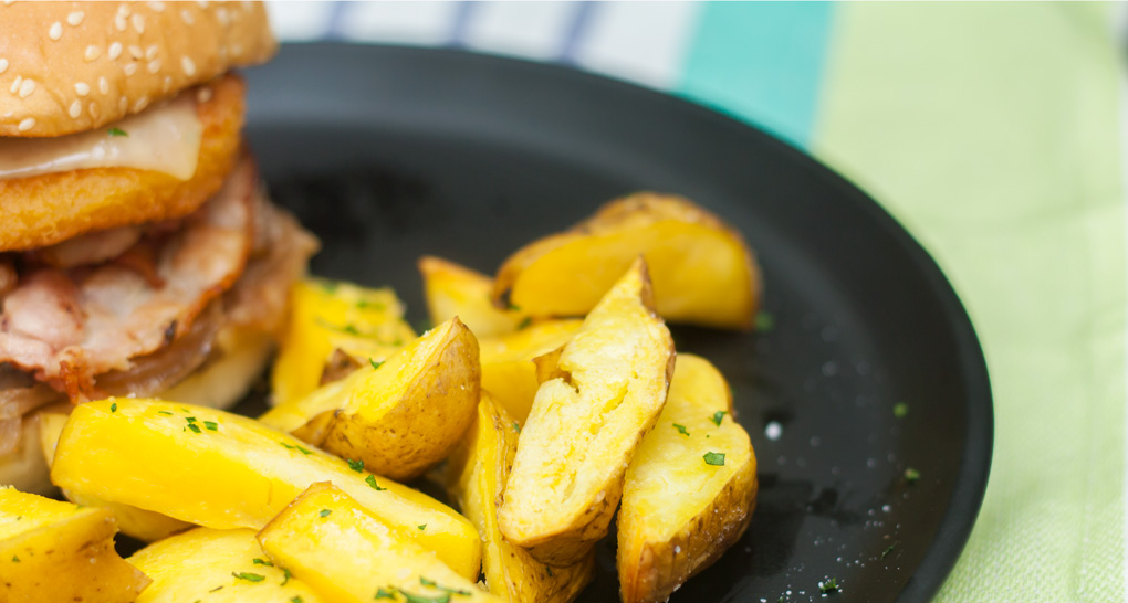 Podemos acompañar la preparación con papas amarillas con cáscara fritas.
