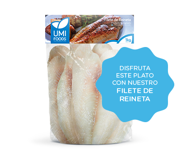 La reineta, la cortamos en pequeños filetes y los sazonamos con sal, pimienta y ajos molidos. Dejamos reposar un poco en el frío. (10min) Hacemos lo mismo con los mariscos, los sazonamos con sal, pimienta y ajos molidos y dejamos reposar.