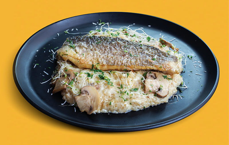 6. Servir con la Lubina frita, los germinados de alfalfa y queso parmesano rallado encima.