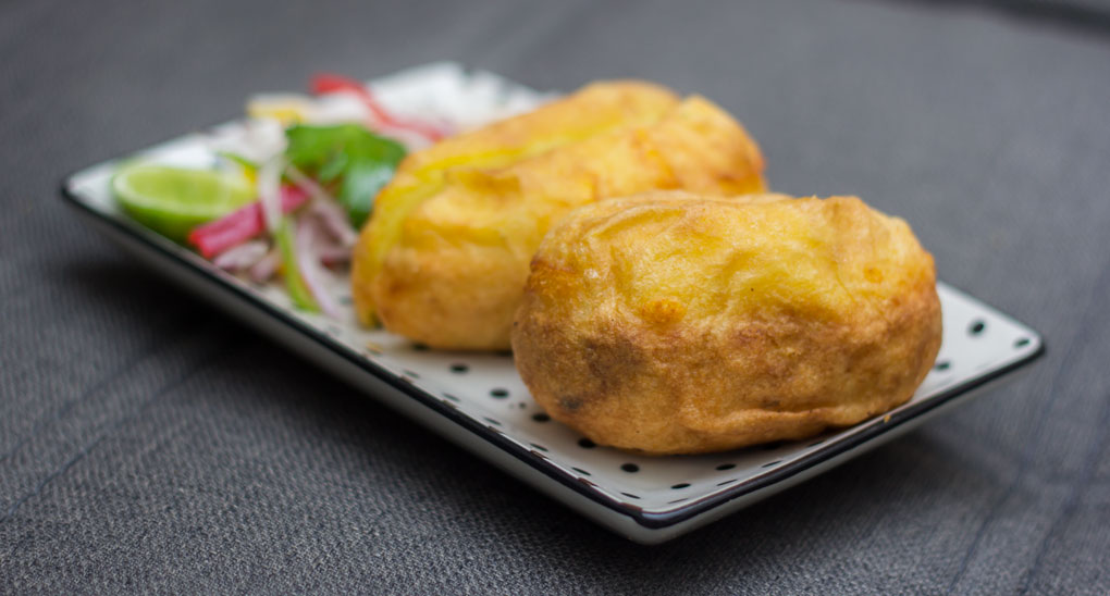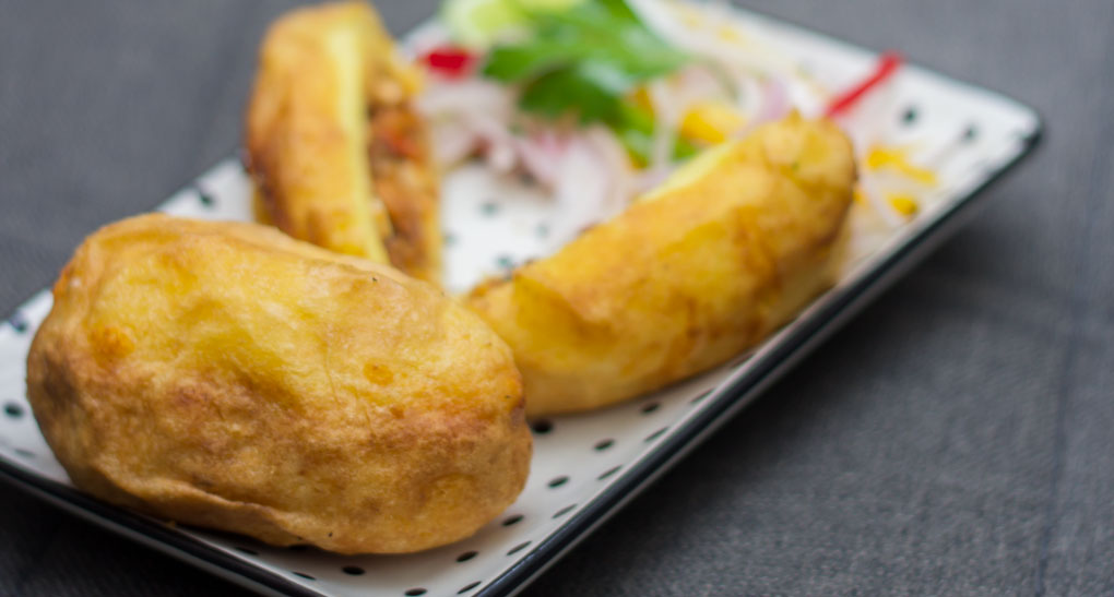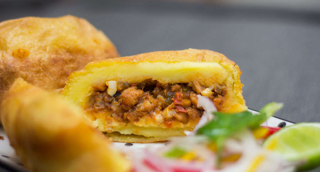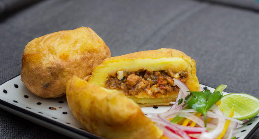 Armamos una base de papa en la palma de nuestra mano y le agregamos el relleno. Procedemos a taparlo con otra base de papa y damos forma. Una vez tenga la forma deseada, la enharinamos y la pasamos por huevo batido.