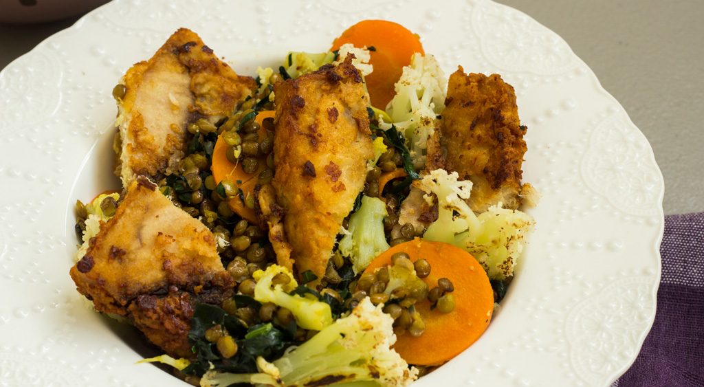 Comenzamos cocinando las lentejas en agua caliente durante media hora o hasta que estén suaves. Sancochamos la coliflor cortada en pequeños ramos y la zanahoria en rodajas delgadas.