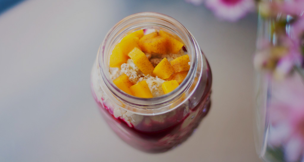 Lo podemos mezclar todo y colocarlo en uno de estos jarritos de vidrio y decoramos con Mango. ¡Un desayuno para llevar delicioso, muy saludable y fácil de hacer para Mamá!