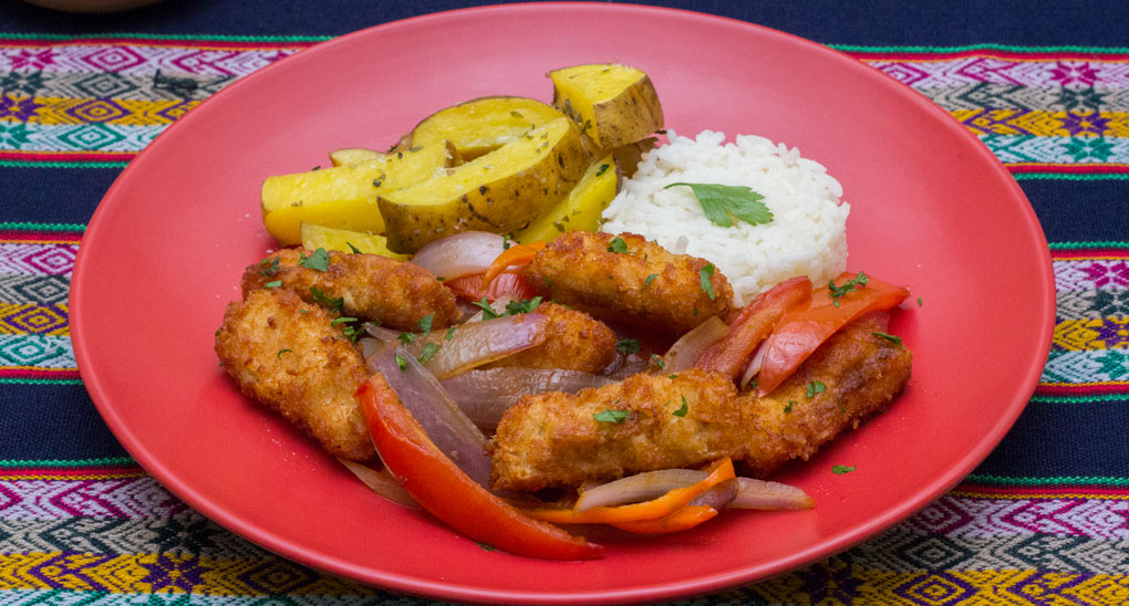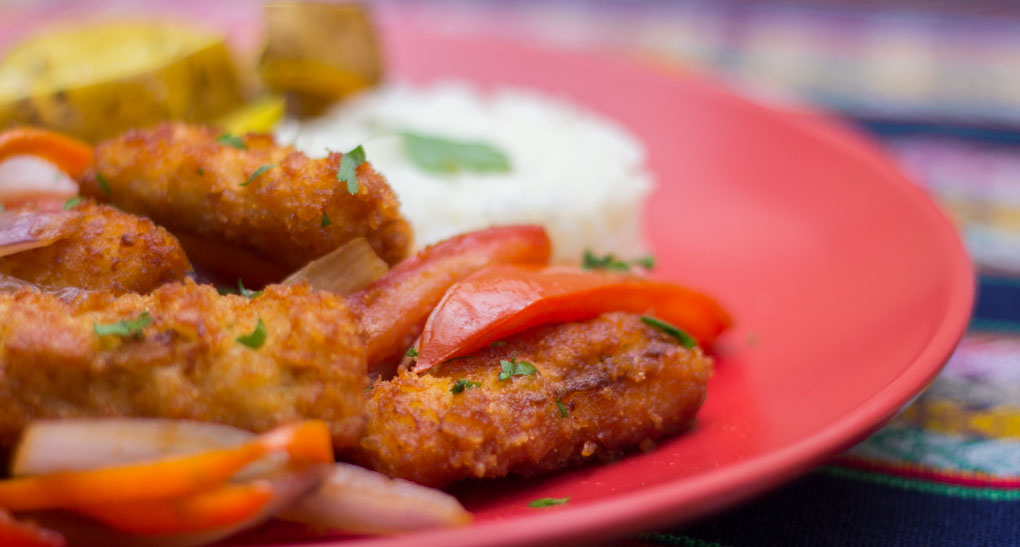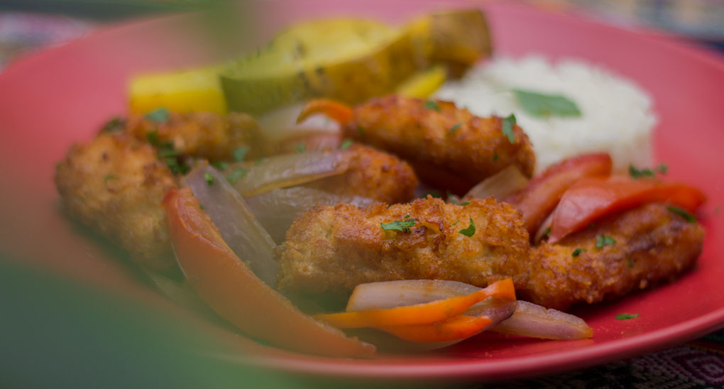 Una vez listo el tiempo de la marinada, procedemos a cortar nuestros filetes en bastones y los empanizamos. Primero por la harina, luego el huevo y finalmente el panco. Los freímos en aceite vegetal, que al menos llegue a la mitad del pescado, a fuego medio. (Se necesita una decente cantidad de aceite para lograr una cocción pareja). Cocinamos hasta lograr un color caramelo por ambos lados.