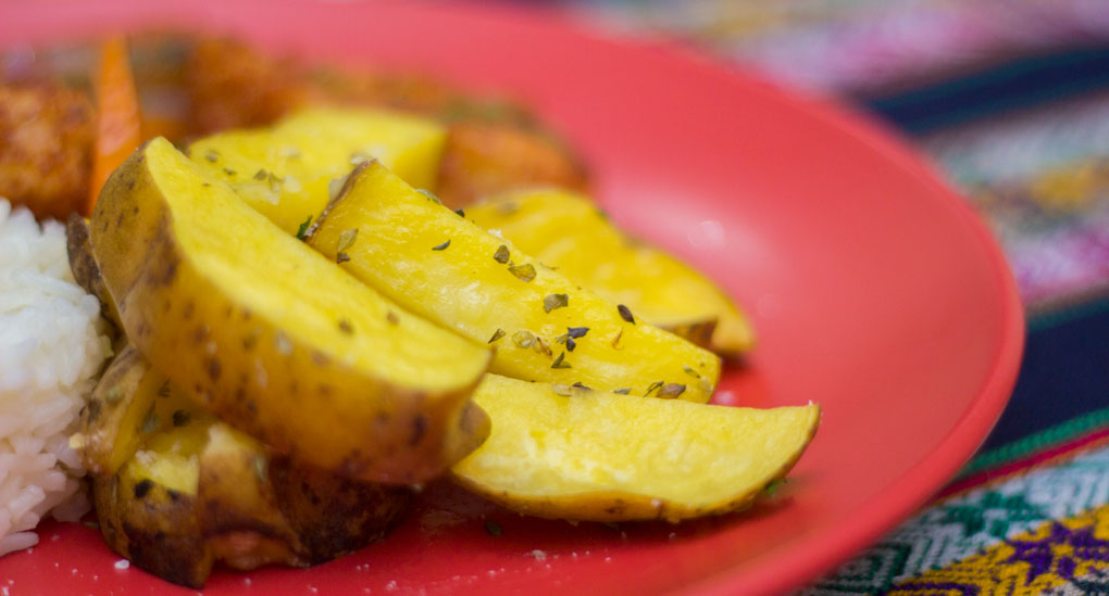 Para las papas, las podemos cocinar al horno cortadas en láminas en un recipiente con aceite vegetal, sal y perejil a 180°c por 15-20 minutos aproximadamente. Fritas es otra opción, en aceite vegetal a fuego medio y una vez listas sazonarlas con sal y pimienta.