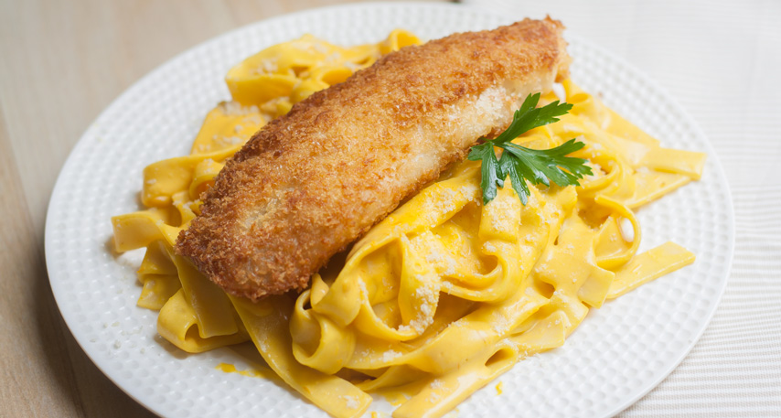 Para el pescado, primero sazonamos (sal, pimienta), luego lo pasamos por harina, proseguimos con el huevo y finalmente el pan rallado o panco. Recordar de no agregar mucho de cada capa de empanizado. Lo freímos en aceite a mediana temperatura.