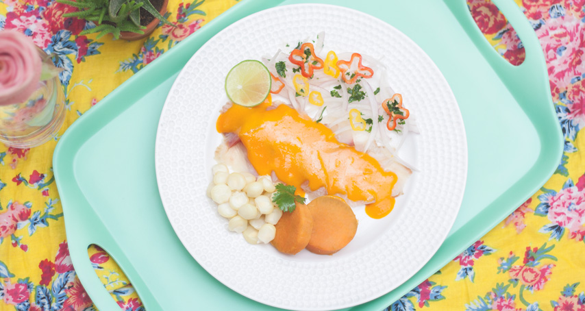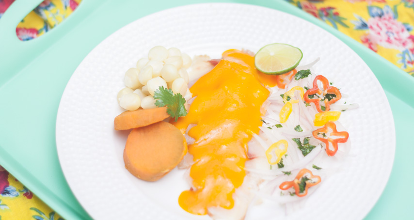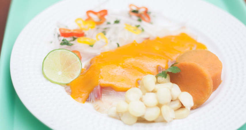 Servimos el camote en rodajas, con el choclo desgranado y encima de las láminas de limón servimos la pasta de ají amarillo.